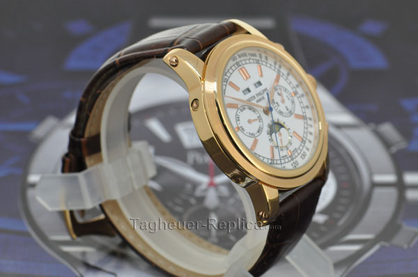 The Patek Philippe Perpetual Calendar features a mechanical automatic movement; opaline-white dial; perpetual calendar complication with the day, date, month & leap year displayed by hands; moon phase display with day/night indicator; sapphire-crystal, transparent case back that is interchangeable with a full back; and 37.2mm.