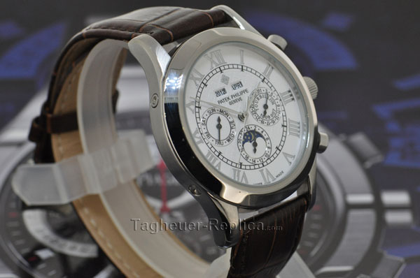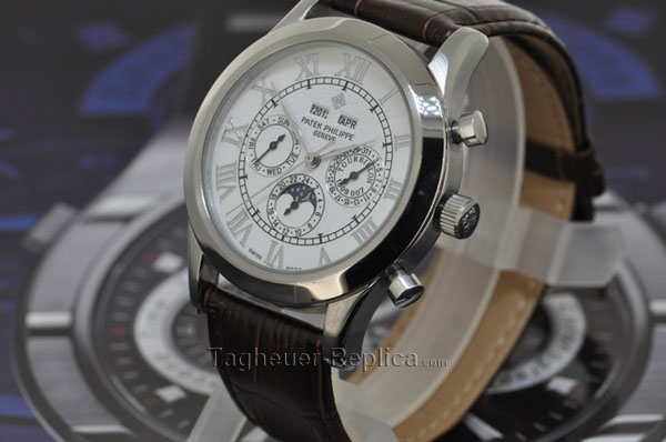 The Patek Philippe Perpetual Calendar features a mechanical automatic movement; opaline-white dial; perpetual calendar complication with the day, date, month & leap year displayed by hands; moon phase display with day/night indicator; sapphire-crystal, transparent case back that is interchangeable with a full back; and 37.2mm.